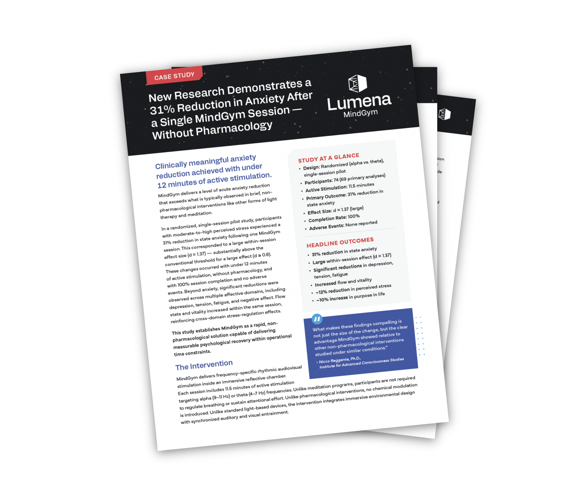 The effect sizes substantially exceeded those reported for comparable light-based or meditation interventions. From a neuroscience perspective, this suggests we are engaging core mechanisms of stress regulation and neural state shifting in a way that is both efficient and measurably distinct.”